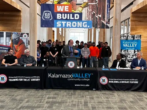 Kalamazoo Valley Community College and the Michigan Regional Council of Carpenters and Millwrights Friday announced a prior learning agreement that will provide college credit at Kalamazoo Valley for apprentices who complete journeyman certification training at MRCC’s training center in Wayland.