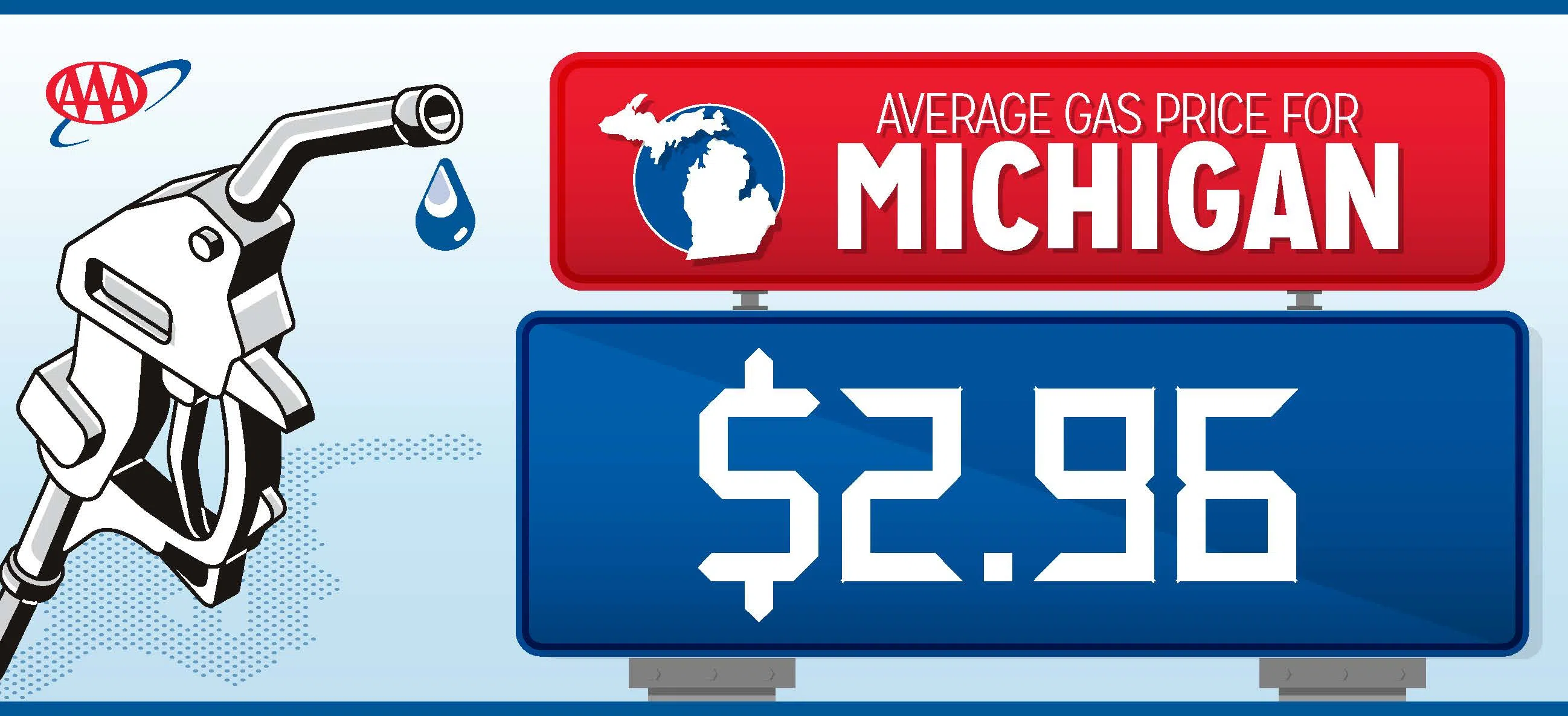 Triple-A Michigan says the average price is now $2.96, 5¢ less than last month and 14¢ less than last year.